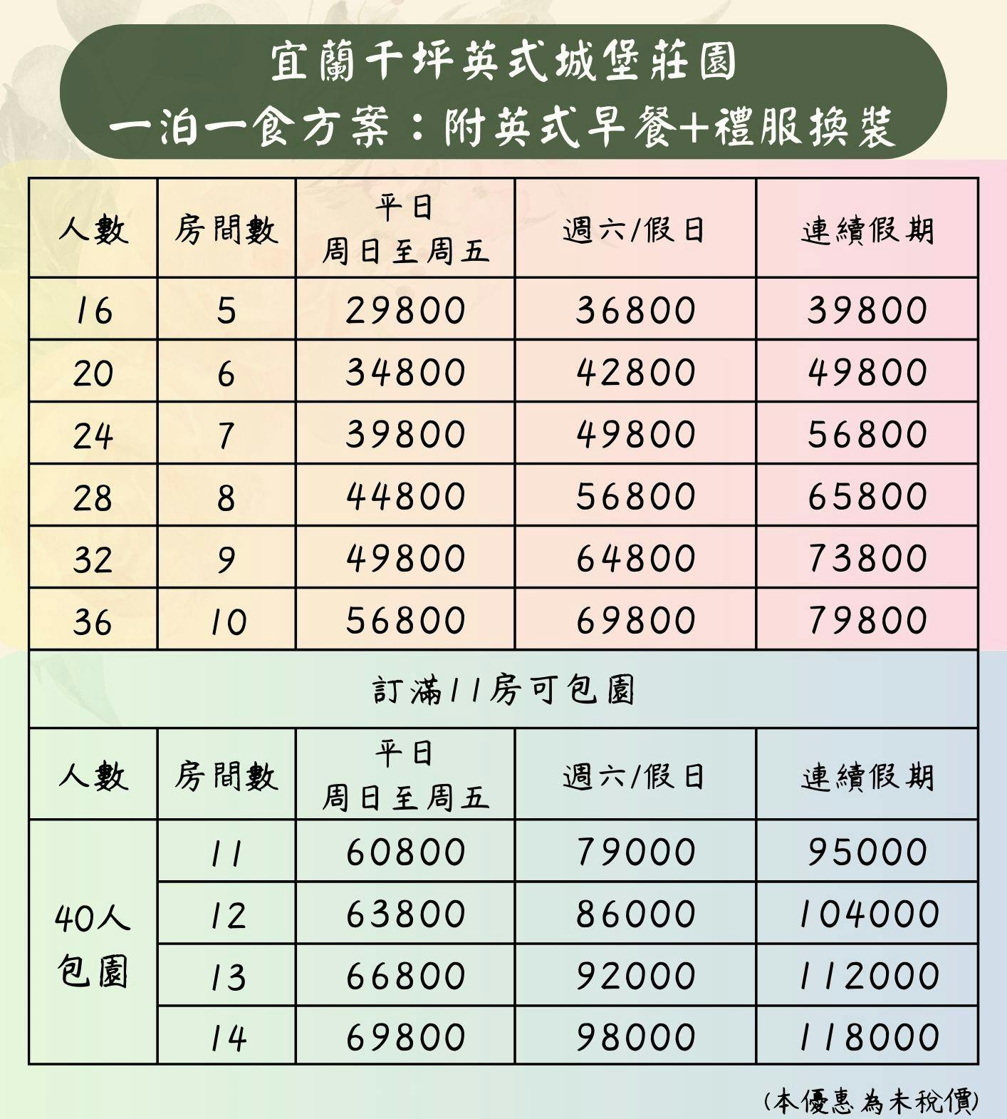● 包園尊榮:訂滿 11 房可包園,適合尾牙、春酒、家庭或企業聚會包場。