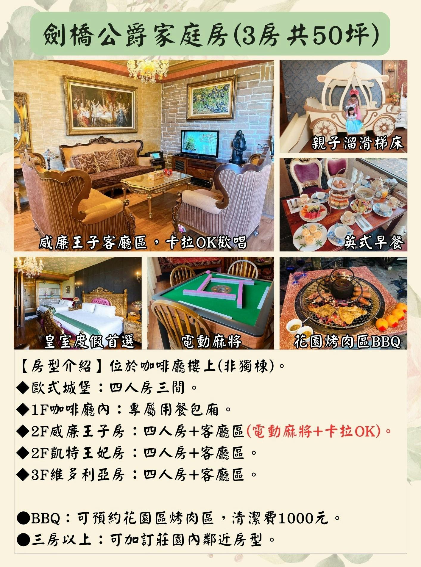 ● 劍橋公爵城堡位於咖啡廳樓上(非獨棟),適合三個家庭或是三代同堂一起入住唷!
